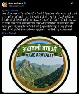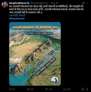 संगीता बिश्नोई नाम की एक यूज़र ने अपने X हैंडल पर लिखा-यह अरावली पर्वतमाला एक पहाड़ नहीं, हमारे संकल्पों का प्रतिबिंब है, और मातृभूमि को बचाने के लिए हम हर संभव प्रयास करेंगे, अरावली पर्वतमाला बचाओ, राजस्थान बचाओ। आज अरावली नहीं तो राजस्थान नहीं..!!