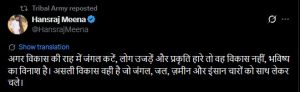 वहीं Hansraj Meena नाम के एक यूज़र ने अपने X हैंडल पर लिखा-अगर विकास की राह में जंगल कटें, लोग उजड़ें और प्रकृति हारे तो वह विकास नहीं, भविष्य का विनाश है। असली विकास वही है जो जंगल, जल, ज़मीन और इंसान चारों को साथ लेकर चले।