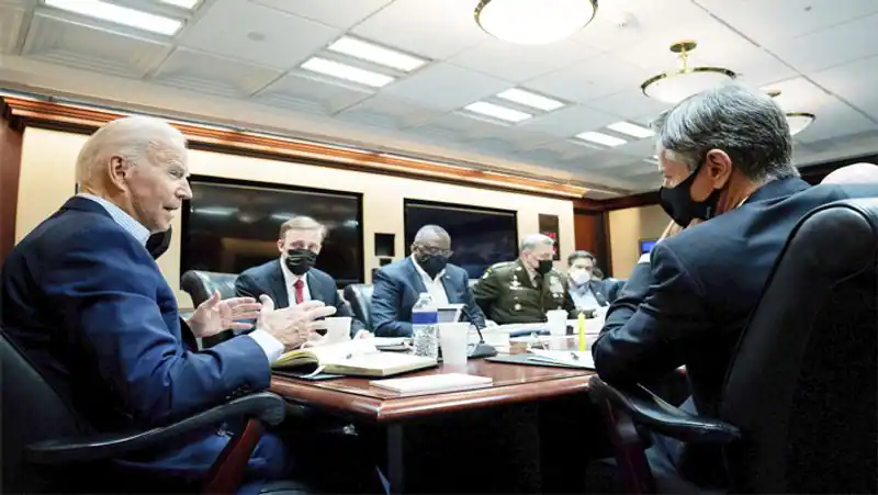 (फाइल फोटो:खुफिया विभाग के अफसरों के साथ सिचुएशन रूम में मीटिंग करते अमेरिकी राष्ट्रपति जो बाइडेन)