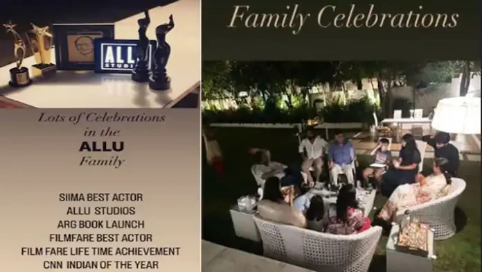 एंटरटेनमेंट डेस्क, Allu Arjun family celebrates on receiving the Filmfare Award : साउथ सुपर स्टार अल्लू अर्जुन ( Allu Arjun ) ने शुक्रवार को सोशल मीडिया पर अपने परिवार के साथ समारोह की एक झलक शेयर की है । अपनी इंस्टाग्राम स्टोरी प ‘पुष्पा’ फिल्म के एक्टर ने फैंस को एक पारिवारिक सेलीब्रेशन की तस्वीर शेयर की है। वहीं उन्होंने एक और तस्वीर में अल्लू और उनके परिवार की अचीवमेंट को दर्शाया है ।