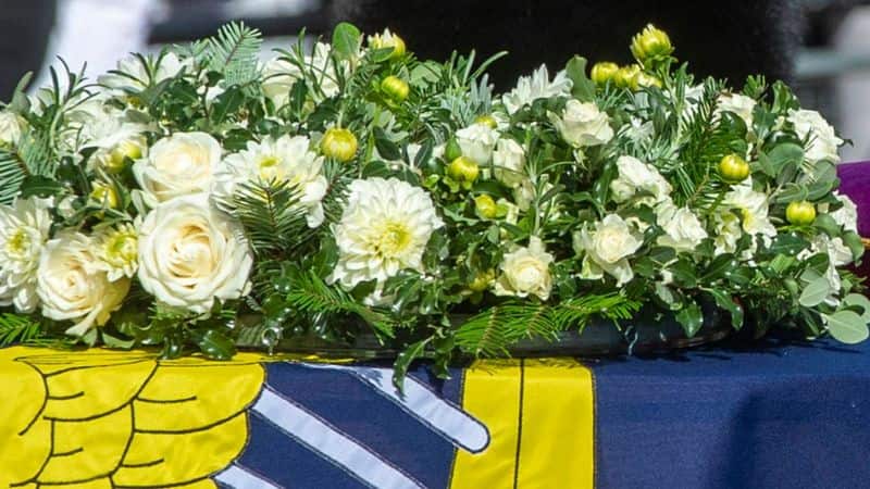 ताबूत को रॉयल स्टैंडर्ड के साथ लपेटा गया है, जो संप्रभु और यूनाइटेड किंगडम का प्रतिनिधित्व करता है।