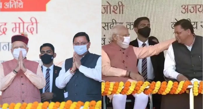 आज देहरादून में प्रधानमंत्री नरेन्द्र मोदी ने उत्तराखंड की 18 हजार करोड़ की विकास परियोजनाओं का शिलान्यास किया। इस दौरान उन्होंने विजय संकल्प रैली को संबोधित किया। इससे पहले मुख्यमंत्री पुष्कर सिंह धामी ने भी जनसभा को संबोधित किया। उन्होंने कहा कि आज प्रधानमंत्री नरेन्द्र मोदी ने देहरादून पहुंचकर विकास की इस यात्रा को और अधिक गति देने जा रहे हैं। हम आपका हार्दिक अभिनंदन करते हैं। सीएम धामी ने कहा सुरक्षित आपके हाथों में संपूर्ण भारतवर्ष है, आपके आशीष से ही संवरता तरूण प्रदेश है, आपके आह्वान पर करोड़ों जन चल पड़े स्वयं पर विश्वास दृढ़कर, विकास पथ पर बढ़ चले आपके अनुराग पर पर्वतजनों को नाज है, आगमन से आपके पुलकित पर्वत राज है। सीएम धामी ने कहा कि यह हमारा सौभाग्य है कि आज हमारा देश नरेन्द्र मादी के अथक परिश्रम एवं कुशल नेतृत्व में विकास के पथ पर निरंतर आगे बढ़ रहा है। बाबा केदार, भगवान बदरी विशाल एवं समस्त देवी-देवताओं का आशीर्वाद आदरणीय प्रधानमंत्री नरेन्द्र मोदी पर हमेशा बना रहे, जिससे आपके नेतृत्व में भारत नित नई ऊंचाईयों को प्राप्त करता रहे।
