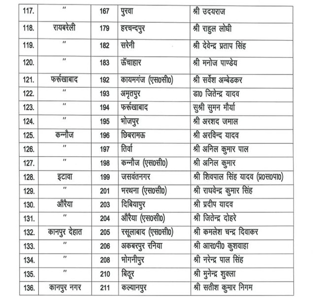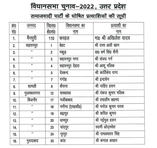 लखनऊ, उत्तर प्रदेश विधानसभा चुनाव के लिए समाजवादी पार्टी ने अब तक घोषित अपने प्रत्याशियों की पूरी लिस्ट पहली बार सार्वजनिक की है। अभी तक समाजवादी पार्टी सीधे नामों का सार्वजनिक ऐलान करने के बजाय खामोशी से प्रत्याशियों को बुलाकर कर उन्हें सिंबल के लिए फॉर्म ए और बी दे रही थी। सिर्फ गठबंधन की सीटें ही घोषित की जा रही थी। सोमवार को जारी की गई उम्मीदवारों की लिस्ट में सपा अध्यक्ष अखिलेश यादव करहल से, रामपुर सीट से आजम खां, स्वार सीट से उनके बेटे अब्दुल्ला आजम बेहट से और शिवपाल सिंह यादव जसवंतनगर से समेत 159 सीटों के लिए प्रत्याशियों के नाम शामिल हैं।
