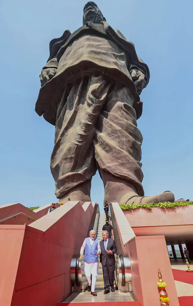 (स्टैच्यू ऑफ यूनिटी अब दुनियाभर में भारत की पहचान बन गई है। 20 अक्टूबर, 2022 को जब संयुक्त राष्ट्र महासचिव एंटोनियो गुटेरेस(United Nation Secretary-General Antonio Guterres) आफिसियल टूर पर भारत आए थे, तब वे पीएम मोद के साथ केवडिया स्थित ‘स्टैच्यू ऑफ यूनिटी’ देखने का मोह नहीं छोड़ पाए थे)