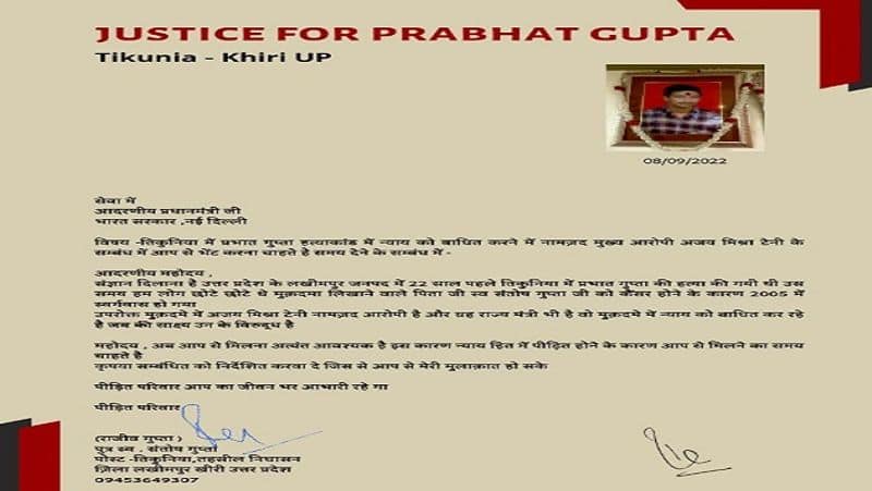 लखीमपुर खीरी: उत्तर प्रदेश के लखीमपुर खीरी में हुए प्रभात हत्याकांड मामले में एक नया मोड़ आ गया है। प्रभात गुप्ता के छोटे भाई राजीव गुप्ता ने इस मामले में प्रधानमंत्री नरेंद्र मोदी को पत्र लिखा है। उन्होंने पत्र में न्याय की गुहार लगाने के साथ ही पीएम से मिलने का समय भी मांगा है। उन्होंने पत्र में केंद्रीय गृह राज्यमंत्री अजय मिश्र टेनी द्वारा न्याय में अवरोध पैदा करने का आरोप लगाया है। उन्होंने पीएम मोदी को लिख गए पत्र में अजय मिश्र टेनी को प्रभात की हत्या का नामजद और मुख्य आरोपी बताया है।