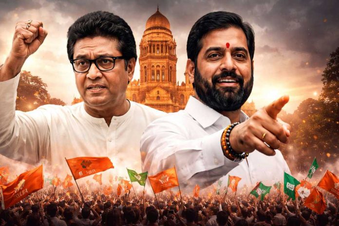 महाराष्ट्र नगर निगम चुनावों के नतीजों के बाद राज्य की राजनीति एक बार फिर गरमा गई है। एक तरफ महाराष्ट्र नवनिर्माण सेना प्रमुख Raj Thackeray ने हार स्वीकार करते हुए ‘मराठी मानुष’ की लड़ाई जारी रखने का ऐलान किया है, तो दूसरी ओर बृहन्मुंबई महानगरपालिका (BMC) के त्रिशंकु नतीजों के बीच डिप्टी सीएम Eknath Shinde ने महापौर पद पर खुलकर दावा ठोक दिया है।