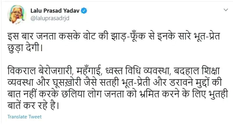 लालू ने भी ट्वीट कर नीतीश पर नीशाना साधा था। उन्होंने लिखा था कि इस बार जनता कसके वोट की झाड़-फूंक से इनके सारे भूत-प्रेत छुड़ा देगी। विकराल बेरोजगारी, महंगाई, ध्वस्त विधि व्यवस्था, बदहाल शिक्षा व्यवस्था और घूसखोरी जैसे सतही भूत-प्रेत और डरावने मुद्दों की बात नहीं करके छलिया लोग जनता को भ्रमित करने के लिए भुतही बातें कर रहे हैं।