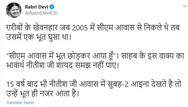 नीतीश के बयान पर प्रतिक्रिया देते हुए पूर्व मुख्यमंत्री राबड़ी देवी ने कहा था कि ‘गरीबों के खेवनहार जब 2005 में मुख्यमंत्री आवास से निकले थे, तब उसमें एक भूत घुसा था।