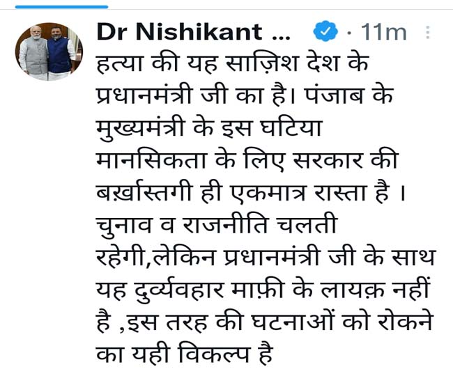 गोड्डा। पंजाब दाैरे के दाैरान प्रधानमंत्री नरेंद्र मोदी सुरक्षा में चूक को लेकर देश की राजनीति गरमा गई है। भाजपा के नेता पंजाब की चरणजीत सिंह चन्नी सरकार और कांग्रेस पर हमलावर हैं। झारखंड के भाजपा नेता भी पंजाब के मुख्यमंत्री चन्नी को सुरक्षा चूक के लिए जिम्मेदार ठहरा रहे हैं। भाजपा के फायरब्रांड सांसद निशिकांत दुबे ने ट्वीट कर चन्नी सरकार की बर्खास्तगी की मांग की है। उन्होंने सुरक्षा में चूक को प्रधानमंत्री नरेंद्र मोदी की हत्या की साजिश करार दिया है। साथ ही कहा है कि इस तरह की घटनाओं को रोकने का बर्खास्तगी ही विकल्प है। झारखंड विधानसभा में भाजपा विधायक दल के नेता बाबूलाल मरांडी और केंद्रीय मानव संसाधन विकास राज्य मंत्री अन्नपूर्णा देवी ने भी ट्वीट कर कांग्रेस पर हमला बोला है।