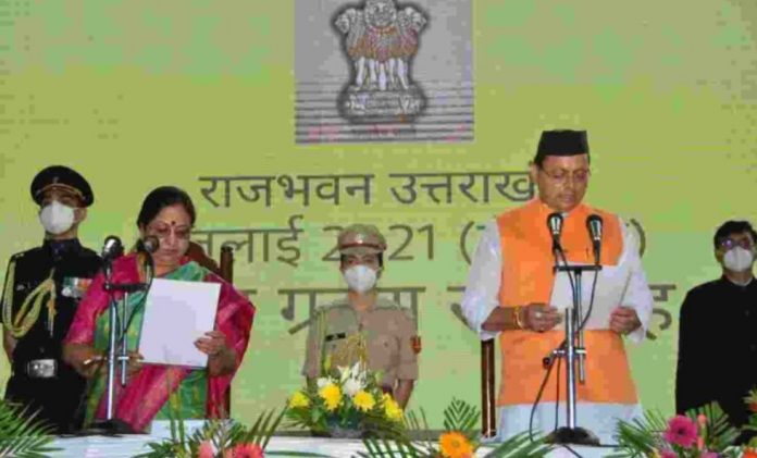भाजपा विधानमंडल दल की बैठक में नेता चुने गए पुष्कर सिंह धामी आज यानी रविवार की शाम पांच बजे के बाद राजभवन में आयोजित एक समारोह में उत्तराखंड के 11वें मुख्यमंत्री की पद और गोपनीयता की शपथ ली। राज्यपाल बेबी रानी मौर्य ने उन्हें शपथ दिलाई। धामी के साथ उनके मंत्रिपरिषद के सदस्यों के रूप में सतपाल महाराज, हरक सिंह रावत, बंशीधर भगत, यशपाल आर्य, बिशन सिंह चुपाल, सुबोध उनियाल, अरविंद पांडे, गणेश जोशी ने कैबिनेट मंत्री और डॉ. धन सिंह रावत, रेखा आर्य, यतीश्वरानंद राज्य मंत्री के रूप में शपथ ली। यानी पूर्व सीएम तीरथ सिंह रावत के कार्यकाल के मंत्रिपरिषद को रिपीट किया गया है। इससे पहले धामी के विधायक दल का नेता चयनित किए जाने से नाराज विधायकों को मनाने का दौर पूरे दिन भर चलता रहा। इसका असर ये हुआ कि नाराज विधायक शपथ ग्रहण समारोह में पहुंच गए थे।