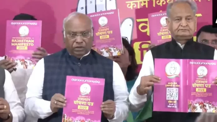 जयपुर। कांग्रेस पार्टी ने 25 नवंबर को होने वाले राजस्थान विधानसभा चुनाव के लिए अपना घोषणा पत्र जारी कर दिया है। कांग्रेस के राष्ट्रीय अध्यक्ष मल्लिकार्जुन खरगे की मौजूदगी में पार्टी ने घोषणा पत्र जारी किया है। इस अवसर पर सीएम अशोक गहलोत, पार्टी के प्रदेश अध्यक्ष और सचिन पायलट समेत कई नेता मौजूद रहे।