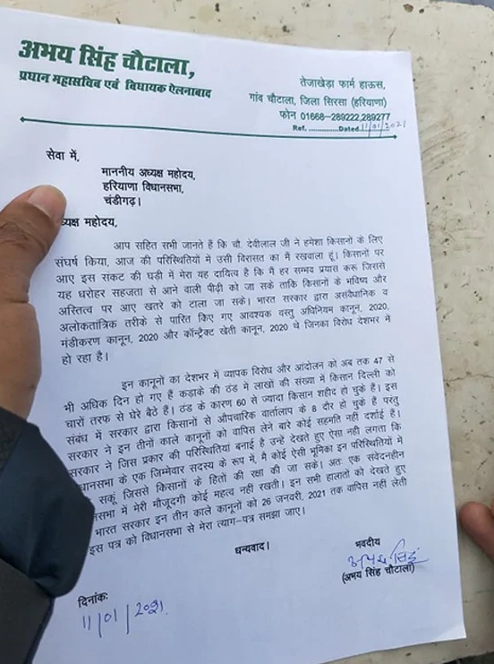 अभयसिंह चौटाला ने कहा कि पूरे देश के किसान इन कानूनों का विरोध कर रहे हैं. चौटाला ने खत में लिखा कि कड़ाके की सर्दी की वजह से 60 से अधिक किसानों ने ‘शहादत’ दे दी है लेकिन केंद्र ने उनकी मांगों पर कोई ध्यान नहीं दिया है. INLD नेता ने कहा कि सरकार ने जो परिस्थितियां पैदा की हैं उनमें सदन का जिम्मेदार सदस्य होने के नाते वह किसानों के अधिकारों को बचाने के लिए कोई भूमिका नहीं निभा पा रहे हैं.