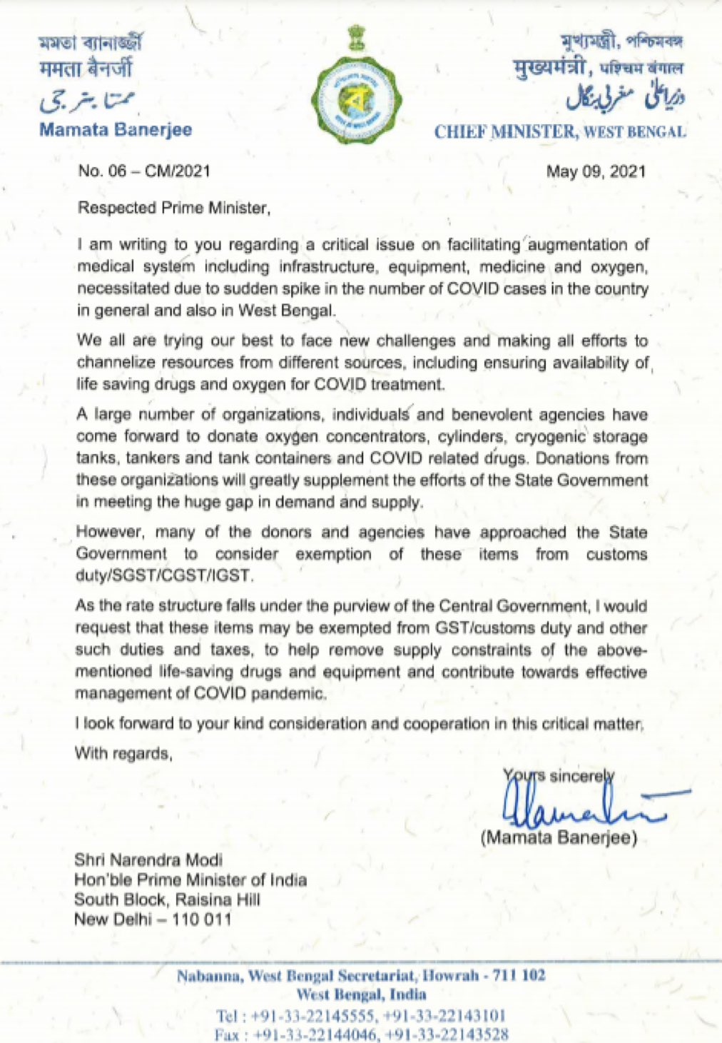 आपको बता दें कि ममता बनर्जी ने पत्र लिखकर कहा था कि राज्य सरकार कोरोना की दूसरी लहर से निपटने की हर कोशिश जारी है। इसके साथ ही उन्होंने बताया था कि कोरोना के दौरान उपजे हालातों के मद्देनजर कई संगठन, व्यक्ति और एजेंसियां मदद के लिए आगे आ रही हैं। वो ऑक्सीजन, क्रायोजेनिक स्टोरेज टैंक, टैंकर्स और कोरोना दवाइयां देने का निवेदन कर रहे हैं, जिसको देखते हुए दानदाताओं ने कस्टम ड्यूटी और जीएसटी में छूट की अपील की है।