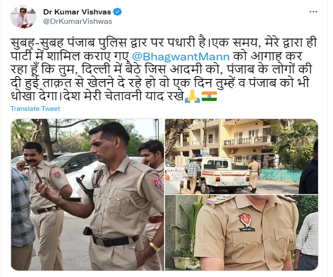 इससे पहले जब पंजाब पुलिस कुमार के घर पहुंची थी तो उन्होंने ट्वीट करते हुए पंजाब के मुख्यमंत्री भगवंत मान को चेतावनी दी। अपने ट्वीट में देश के जाने-माने कवि कुमार विश्वास ने दिल्ली के मुख्यमंत्री अरविंद केजरीवाल को निशाना बनाते हुए लिखा था कि – ‘सुबह-सुबह पंजाब पुलिस द्वार पर पधारी है। एक समय, मेरे द्वारा ही पार्टी में शामिल कराए गए भगवंत मान को आगाह कर रहा हूं कि तुम, दिल्ली में बैठे जिस आदमी को, पंजाब के लोगों की दी हुई ताकत से खेलने दे रहे हो वो एक दिन तुम्हें व पंजाब को भी धोखा देगा। देश मेरी चेतावनी याद रखे।’