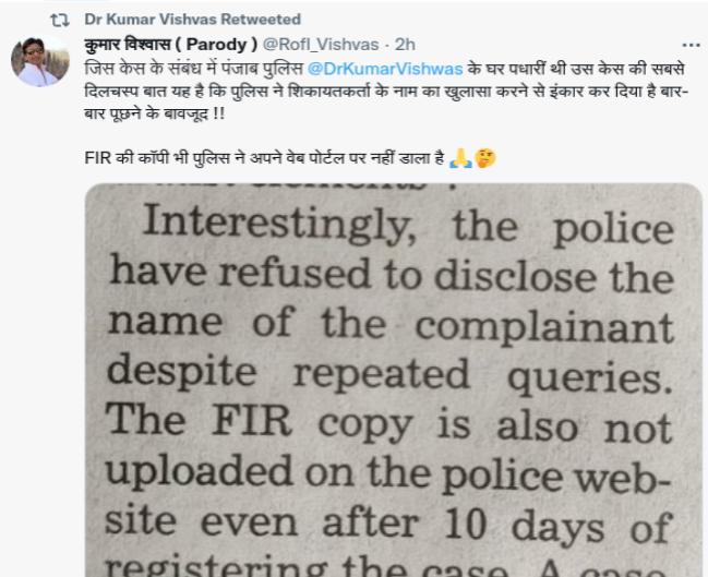 नई दिल्ली, पंजाब में कवि कुमार विश्वास पर दर्ज केस के मामले में दो दिलचस्प बातें सामने आई हैं। ये दोनों बातें अब इंटरनेट मीडिया पर वायरल हैं। पहली बात तो ये है कि जिस केस में पंजाब पुलिस कुमार विश्वास के गाजियाबाद वसुंधरा स्थित घर पर पहुंची थी उसमें पुलिस ने शिकायतकर्ता के नाम का खुलासा करने से इंकार कर दिया। दूसरी खास बात ये है कि जो एफआइआर दर्ज की गई है उसको पुलिस ने अब तक अपने वेब पोर्टल पर नहीं डाला है। जबकि इस तरह के मामले में किसी भी तरह के आरोप-प्रत्यारोप से बचने के लिए पुलिस बहुत सावधानी बरतती है और सब कुछ शीशे की तरह साफ रखकर आगे बढ़ती है।