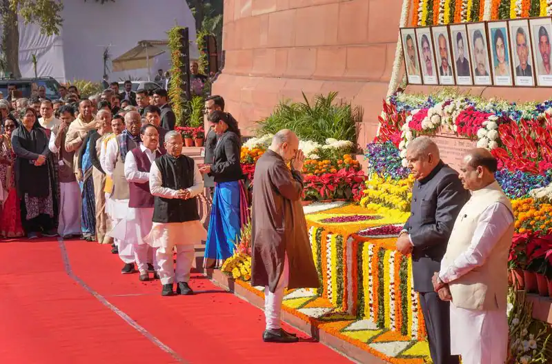 (गृहमंत्रीअमित शाह और अन्य नेता भवन परिसर में 2001 के संसद हमले की 21वीं बरसी पर शहीदों को श्रद्धांजलि देने के लिए एक श्रद्धांजलि समारोह के दौरान)