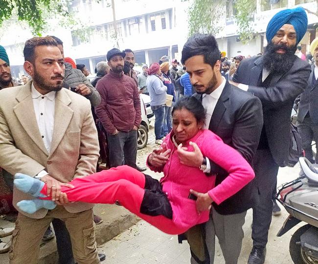 लुधियाना में पुराने कचहरी परिसर में धमाके के बाद घायल हुई एक महिला को बाहर लेकर आते हुए मौके पर मौजूद लोग। धमाके बाद पूरे कचहरी परिसर में दहशत है। धमाके की सूचना के बाद लोग अपनों को फोन घनघनाते लगे हैं।
