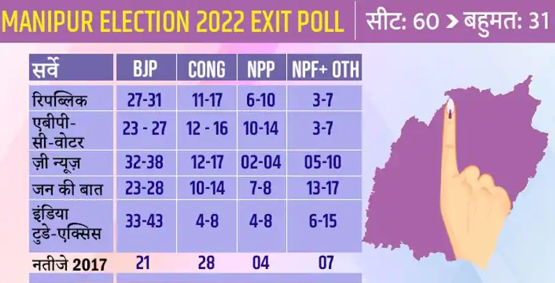 India News-Jan Ki Baat- मणिपुर एग्जिट पोल के नतीजे लाइव: बीजेपी को 23-28 सीटें मिलने की संभावना, कांग्रेस को 10-14 सीटें मिल सकती है।एनपीपी 7 – 8 , एनपीएफ 5 – 8 और अन्य 8 – 9 सीटें मिल सकती हैं।