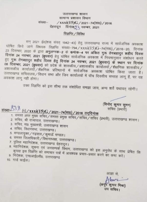 उत्तराखंड में आज बुधवार को सरकारी अवकाश घोषित किया गया है। सन् 2021 ई0 ( शक संवत् 1942-43) हेतु उत्तराखण्ड राज्य में सार्वजनिक अवकाश घोषित किये जाने विषयक विज्ञप्ति संख्या – 794 / xxx i (15)G-74 (सा०) /2016-20, दिनांक 23 दिसम्बर, 2020 के द्वारा अनुलग्नक-2 के कमांक-4 पर अंकित गुरू तेगबहादुर शहीद दिवस दिनांक 24 नवम्बर, 2021 (बुधवार) हेतु घोषित सार्वजनिक अवकाश में नियमानुसार संशोधन करते हुए गुरू तेगबहादुर शहीद दिवस हेतु दिनांक 24 नवम्बर, 2021 (बुधवार) के स्थान पर दिनांक 08 दिसम्बर, 2021 (बुधवार) को प्रदेश के शासकीय / अशासकीय कार्यालयों / शैक्षणिक शासकीय / अशासकीय कार्यालयों / शैक्षणिक प्रतिष्ठानों में सार्वजनिक अवकाश घोषित किया जाता है। उत्तराखण्ड सचिवालय / विधान सभा और जिन कार्यालयों में पाँच दिवसीय सप्ताह लागू हैं, पर यह अवकाश लागू नहीं होगा।