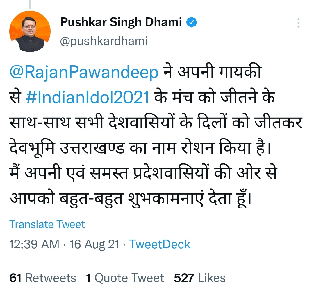 इंडियन आइडल 12 में पवनदीप राजन के विजेता चुने जाने के बाद से उत्तराखंड में भी खुशी का माहौल है। सीएम पुष्कर सिंह धामी ने भी उन्हें बधाई दी है। कहा कि उत्तराखंड में प्रतिभा की कोई कमी नहीं है। धामी ने कहा कि उत्तराखंड के युवाओं ने हर क्षेत्र में उम्दा प्रदर्शन कर अपना लोहा मनवाया है। बाबा केदार से उनके उज्ज्वल भविष्य की कामना की है।