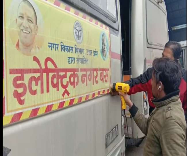 आदर्श आचार संहिता के पालन में हटाई गई ई-बसों से सीएम योगी और नगर विकास मंत्री की तस्वीर
