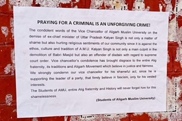पोस्टर में कहा गया है, “उत्तर प्रदेश के पूर्व मुख्यमंत्री कल्याण सिंह के निधन पर अलीगढ़ मुस्लिम विश्वविद्यालय के कुलपति के शोक शब्द ना केवल शर्म की बात है बल्कि हमारे समुदाय की धार्मिक भावनाओं को भी आहत करते हैं क्योंकि यह लोकाचार, संस्कृति और परंपरा के खिलाफ है। कल्याण सिंह बाबरी मस्जिद विध्वंस में ना केवल मुख्य अपराधी है, बल्कि सुप्रीम कोर्ट के आदेश के संबंध में तिरस्कार के भी अपराधी है।”