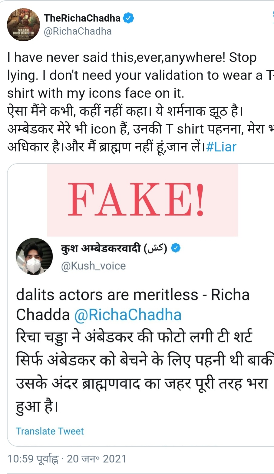 शख्स द्वारा लगाए गए इन आरोपों का जवाब एक्ट्रेस ऋचा चड्ढा (Richa Chadha) ने भी बखूबी दिया है. एक्ट्रेस ने शख्स के ट्वीट का स्क्रीनशॉट पोस्ट करते हुए लिखा, ‘ऐसा मैंने कभी, कहीं नहीं कहा. ये शर्मनाक झूठ है. अम्बेडकर मेरे भी आइकन हैं, उनकी टी-शर्ट पहनना, मेरा भी अधिकार है और मैं ब्राह्मण नहीं हूं, जान लें.’ ऋचा चड्ढा के इस ट्वीट पर लोग खूब कमेंट कर रहे हैं और अपनी प्रतिक्रिया दे रहे हैं.