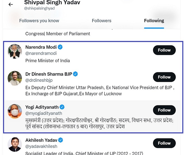 शिवपाल सिंह यादव के भाजपा में शामिल होने या फिर भाजपा की मदद से राज्यसभा में जाने के कयास लग ही रहे थे कि उनका भाजपा नेताओं के प्रति अचानक बढ़ा प्रेम सामने आ ही गया है। उत्तर प्रदेश विधानसभा चुनाव के नतीजे आने के बाद से ही अखिलेश यादव और शिवपाल यादव के बीच तल्खी लगातार बढ़ती गई। अब तो शिवपाल के भारतीय जनता पार्टी में जाने को लेकर भी अटकलबाजियों के बीच में शिवपाल सिंह यादव ने सोशल मीडिया पर वरिष्ठ भाजपा नेताओं को फालो किया। उन्होंने सोशल मीडिया ऐप कू पर सीएम योगी आदित्यनाथ व सीएम आफिस उत्तर प्रदेश को फालो किया तो ट्विटर पर पीएम मोदी और सीएम योगी को फॉलो किया है । इसके अलावा शिवपाल यादव ने पूर्व डिप्टी सीएम रहे डॉ. दिनेश शर्मा को भी फॉलो किया है। पहले शिवपाल केवल पीएमओ और सीएमओ को ही फॉलो करते थे। पीएम और सीएम के ट्विटर को फॉलो करने के बाद सियासी गलियारों में एक बार फिर से प्रसपा अध्यक्ष के भाजपा में शामिल होने को लेकर चर्चाएं तेज हो गई हैं। ऐसा होने के बाद से तो लग रहा है कि शिवपाल ने इसको अपने भविष्य के कदम का संकेत देने का काम किया है।