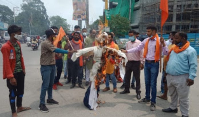 मंगलवार को भैरव सेना के आक्रोशित कार्यकर्ता जिला संयोजक सौरभ पार्छा के नेतृत्व में कनक चौक पर एकत्र हुए। वहां से मौलाना फैजान रजा का पुतला घसीटते हुए जूतों की माला डालकर उग्र नारेबाजी करते हुए लैंसडाउन चौक पर पहुंचे, और आक्रोशित हो पुतले को आग लगा दी।