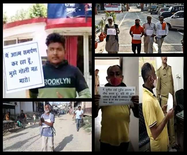 कुछ ऐसा ही गोंडा में भी हुआ। जहां गल्ला व्यवसायी के अपहरण के मामले में वांछित 25 हजार रुपये के इनामी गौतम सिंह ने 15 मार्च को छपिया थाने में समर्पण किया था। आरोपित गौतम अपने भाई के साथ थाने पहुंचा था और उसके हाथ में एक तख्ती थी, जिस पर लिखा था कि मैं आत्मसमर्पण कर रहा हूं मुझे गोली मत मारो।