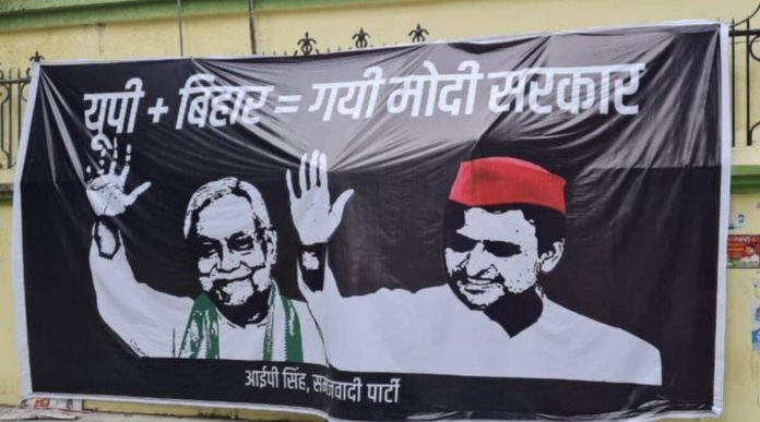 विपक्षी दलों को एक साथ लाने की नीतीश कुमार की कोशिशों के बीच अब उत्तर प्रदेश से एक तस्वीर सामने आई है, जिसमें नीतीश कुमार और अखिलेश यादव नजर आ रहे हैं। दोनों की तस्वीर वाले पोस्टर में लिखा है, “यूपी+बिहार= गयी मोदी सरकार।” बता दें कि इस पोस्टर पर सपा नेता आईपी सिंह का नाम लिखा है।