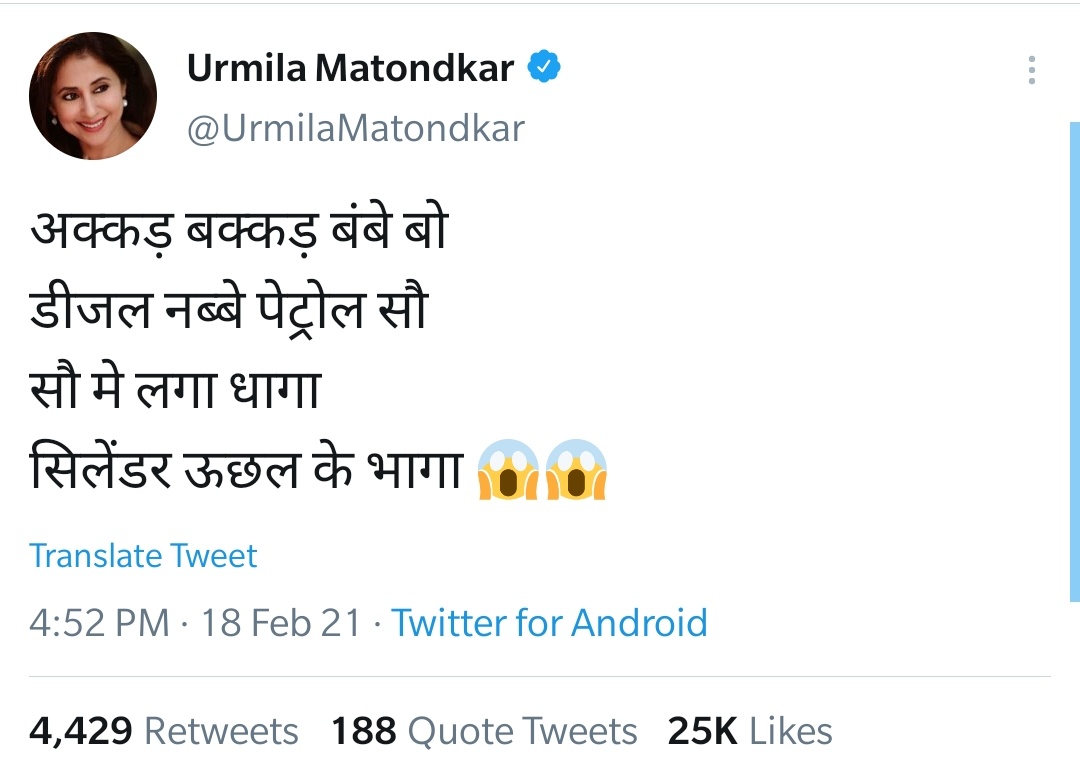 पेट्रोल और डीजल की कीमतों में लगातार बढ़ोत्तरी हो रही है। लगातार दसवें दिन कीमतें रिकॉर्ड छू रही हैं। देश के कई हिस्सों में पेट्रोल 100 प्रति लीटर से ऊपर पहुंच गया है। इसे लेकर बॉलीवुड एक्ट्रेस और शिवसेना नेता उर्मिला मातोंडकर ने ट्वीट किया है। सरकार पर निशाना साधते हुए उर्मिला मातोंडकर ने अपने ट्विटर हैंडल पर लिखा ‘अक्कड़ बक्कड़ बंबे बो, डीजल नब्बे पेट्रोल सौ, सौ में लगा धागा, सिलेंडर ऊछल के भागा।’ इस ट्वीट पर खूब रिएक्शन आ रहे हैं और इसे रिट्वीट भी किया जा रहा है।