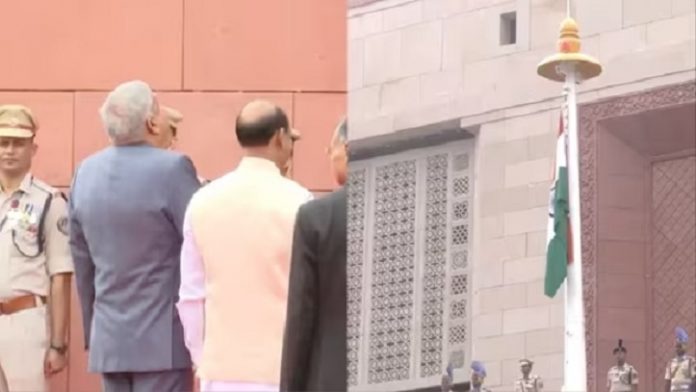नई दिल्ली। उपराष्ट्रपति और राज्यसभा के सभापति जगदीप धनखड़ ने आज नए संसद भवन में राष्ट्रीय ध्वज फहराया। बता दें कि सोमवार से संसद का विशेष सत्र शुरू होने जा रहा है। इसी सत्र के दौरान संसदीय कार्यवाही पुराने से नए भवन में स्थानांतरित हो सकती है। ऐसे में संसद का विशेष सत्र शुरू होने से एक दिन पहले ही नए संसद भवन पर राष्ट्रीय ध्वज फहराया गया।