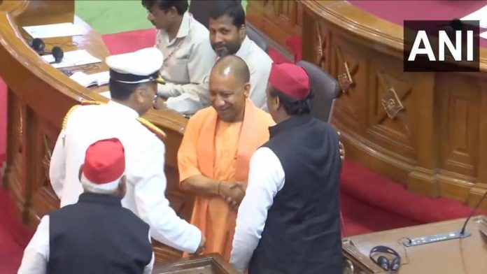 #WATCH Uttar Pradesh CM Yogi Adityanath meets Leader of Opposition Akhilesh Yadav in the Legislative Assembly during oath-taking of newly-elected legislators #Lucknow pic.twitter.com/7r6fX7ErjX